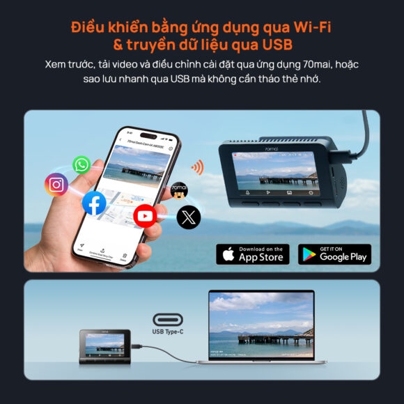 Điều khiển dễ dàng, truyền tải linh hoạt. Mẫu A800SE độ phân giải 4K được tích hợp Wi-Fi 6 (2.4GHz), mang lại kết nối nhanh hơn và ổn định hơn. Chỉ cần kết nối điện thoại với điểm phát Wi-Fi của camera hành trình qua ứng dụng 70mai để xem trước, tải video hoặc điều chỉnh cài đặt theo thời gian thực—không cần dây cáp.
