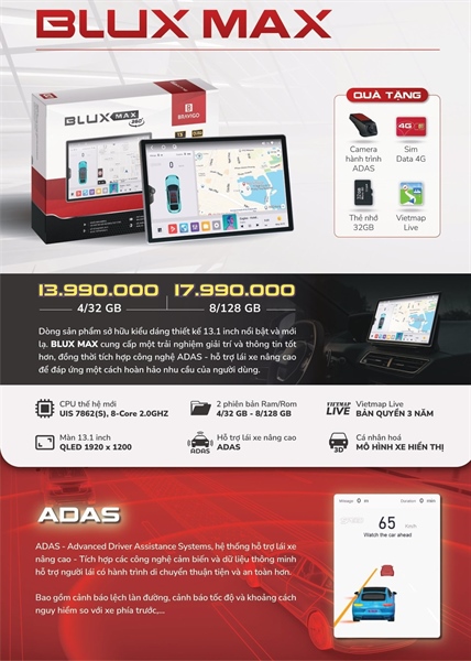 RAM 4GB | ROM 32GBCOMBO KÈM CAMERA 36017.500.000 VNĐRam4GBRom32GBKích thước13.1 inchĐộ phân giải1920 x 1200Quà TặngTặng SIM 4GTặng thẻ nhớ 32GTặng USB 32GCamera hành trình adasVIETMAP LIVEBấm vào đâyĐiều gì khiến bạn quyết định chọn BLUX MAX?Kích thước lớn với tỉ lệ 16:10Hiệu năng đẳng cấpĐa nhiệm thông minh với MIND UICảnh báo khoảng cách an toàn với xe phía trướcCảnh báo lệch làn đườngMotion SensorSự giao thoa giữa công nghệ và thẩm mỹMỏng nhẹ, Tinh tế và Sắc nétBLUX MAX thể hiện sự kết hợp hoàn hảo giữa thiết kế sang trọng, màn hình lớn và hiển thị sắc nét, mang đến cho người dùng một trải nghiệm cao cấp và thú vị. Thiết kế của BLUX MAX được giữ mỏng và thon gọn, tạo điểm nhấn về sự thanh thoát và hiện đại