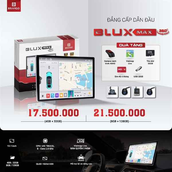 RAM 8GB | ROM 128GBCOMBO KÈM CAMERA 36021.500.000 VNĐRam8GBRom128GBKích thước13.1 inchĐộ phân giải1920 x 1200Quà TặngTặng SIM 4GTặng thẻ nhớ 32GTặng USB 32GCamera hành trình adasVIETMAP LIVEBấm vào đâyĐiều gì khiến bạn quyết định chọn BLUX MAX?Kích thước lớn với tỉ lệ 16:10Hiệu năng đẳng cấpĐa nhiệm thông minh với MIND UICảnh báo khoảng cách an toàn với xe phía trướcCảnh báo lệch làn đườngMotion SensorSự giao thoa giữa công nghệ và thẩm mỹMỏng nhẹ, Tinh tế và Sắc nétBLUX MAX thể hiện sự kết hợp hoàn hảo giữa thiết kế sang trọng, màn hình lớn và hiển thị sắc nét, mang đến cho người dùng một trải nghiệm cao cấp và thú vị. Thiết kế của BLUX MAX được giữ mỏng và thon gọn, tạo điểm nhấn về sự thanh thoát và hiện đại