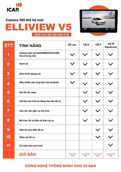 Camera 360 ICAR Elliview V5-PCamera 360 ICAR Elliview V5 là sản phẩm công nghệ xe hơi của ICAR Việt Nam. Camera 360 ICAR Elliview V5-P là bộ camera 360 chuyên nghiệp phiên bản cá nhân hóa. Có thêm một số tính năng mới.18,400,000đCamera 360 ICAR Elliview V5-PCamera siêu nétTích hợp nhiều chế độ hình ảnh AHD/HDMI/VGA/CVBSĐa dạng góc nhìnThể hiện toàn bộ các góc toàn cảnh trước, sau.Hiển thị tốc độ trên videoHiển thị chính xác tốc độ ODO của xe.Built-in:Ghi tốc độ video, giám sát đỗ xe.Tích hợp sẵn:Hỗ trợ đánh lái nếu xe có cân bằng điện tử.Xóa nền đen mô hìnhXóa nền đen mô hình của ô tô trên camera 360 là tính năng mới của Elliview V5. Có hiệu lực với những file mô hình được thiết kế cho Elliview V5. Hiện tại mô hình xe dành cho phiên bản V5 đang tiếp tục được nghiên cứu và phát triển. Do đó, một số dòng xe tạm thời chưa có mô hình. Quý khách vui lòng truy cập tại đây để xem thông tin các xe đã có mô hình và tải file.