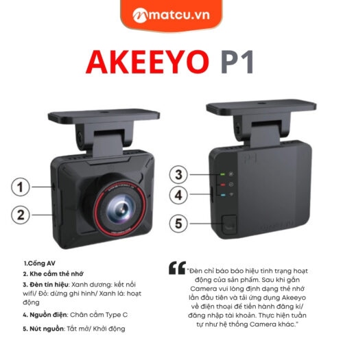 Thương hiệu: Akeeyo – Nhật Bản.Mã sản phẩm: Akeeyo Aky P1Video Full HD 1080P rõ nét: Ghi lại mọi chi tiết với độ phân giải video chất lượng cao.Ống kính góc rộng 120 độ: Góc quay rộng bao quát phía trước xe.WDR (Dải động rộng): Ghi lại cảnh quay rõ nét trong nhiều điều kiện ánh sáng khác nhau, từ ánh sáng mặt trời rực rỡ đến tình huống thiếu sáng vào ban đêmThẻ nhớ hỗ trợ: 64Gb.Ghi vòng lặp hiệu quả: Tự động ghi đè lên các video cũ bằng tính năng ghi vòng lặp, tối đa hóa hiệu quả lưu trữ.Cảm biến G: Cảm biến G tích hợp sẽ khóa video hiện tại khi có va chạm, bảo vệ bằng chứng quan trọng.Kết nối Wi-Fi liền mạch với ứng dụng AKEEY0 để quản lý nội dung dễ dàng.Điều khiển bật/tắt nguồn và ghi âm chỉ bằng một chạm tiện lợi cho thao tác nhanh chóng.Nhỏ gọn, dễ dàng lắp đặt.