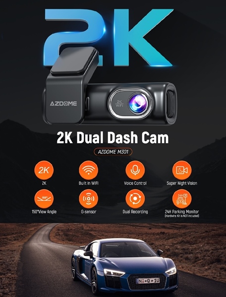 AZDOME M301 Dash Cam Phía trước Phía sau 2K + 720P Tích hợp Wi-Fi Điều khiển bằng giọng nói Camera hành trình cho Ô tô
