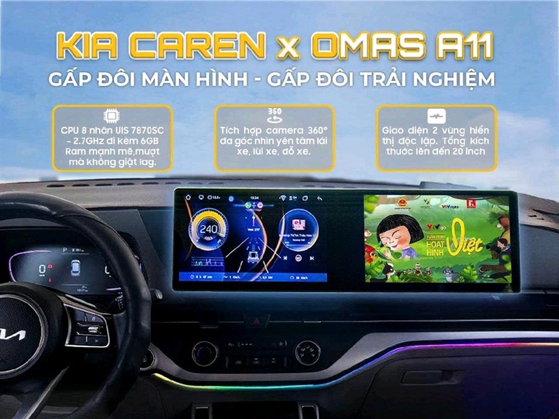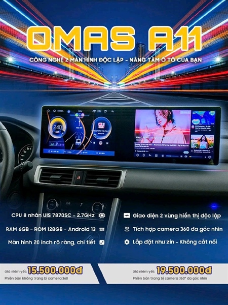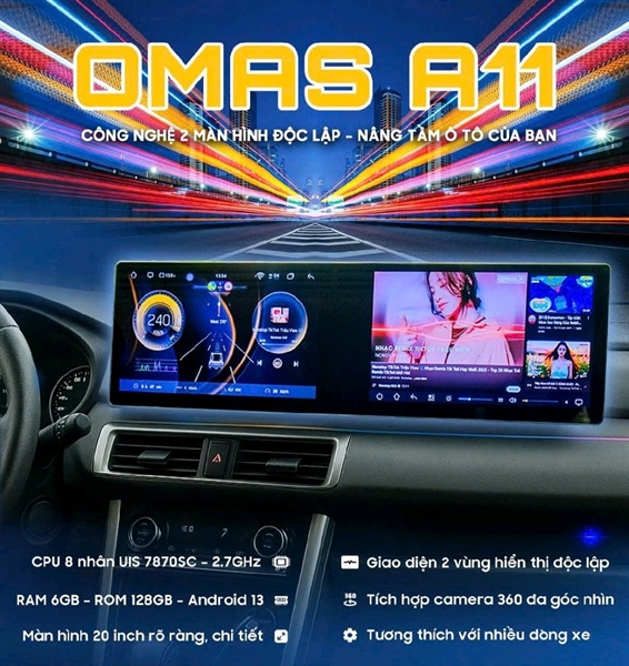 Màn Hình Đôi Android Omas A11 – Nâng Tầm Trải Nghiệm Lái XeTrải nghiệm lái xe trong thời đại mới không chỉ đơn thuần là di chuyển, mà còn là sự tận hưởng tiện ích, an toàn và giải trí thông minh ngay trên chiếc xe của bạn.Màn hình kép Omas A11, ra đời để đáp ứng trọn vẹn nhu cầu đó – một thiết bị tiên tiến, kết hợp giữa cấu hình siêu mạnh, thiết kế đột phá và công nghệ thông minh.Cùng khám phá ngay Omas A11 – chiếc màn hình đôi độc quyền chỉ có tại OMAS, siêu phẩm chất lượng đáp ứng đầy đủ mọi tính năng mà người dùng cần!1. Thiết Kế Màn Hình Đôi Độc Đáo – Tối Ưu Hiển Thị - Phù Hợp Với Nhiều Dòng XeOmas A11 sở hữu thiết kế màn hình kép hoàn toàn mới:Kích thước 10 inch + 10 inch với độ phân giải Full HD 1280x720 pixels, mang đến hình ảnh sắc nét, màu sắc sống động.Vỏ ngoài được hoàn thiện cao cấp, bền bỉ, chống trầy xước, đồng bộ hoàn hảo với nội thất các dòng xe hiện đại.Thiết kế thông minh này không chỉ tăng thêm vẻ sang trọng cho khoang lái mà còn tối ưu hóa không gian hiển thị, cho trải nghiệm thị giác cực kỳ ấn tượng. Ngoài ra, Omas A11 sở hữu thiết kế tinh tế, đẳng cấp, thích hợp cho nhiều dòng xe từ sedan, SUV đến các mẫu xe gia đình. Với kích thước màn hình đôi 10 inch + 10 inch, sản phẩm này dễ dàng lắp đặt và tạo sự hài hòa trong không gian nội thất của xe. Bên cạnh đó, màn hình được thiết kế viền mỏng, sở hữu rảnh phân chia được tinh chỉnh tinh tế và nhỏ gọn, tối đa hóa diện tích hiển thị, mang đến trải nghiệm hình ảnh sống động và trực quan. Vỏ màn hình được chế tác từ chất liệu cao cấp, bền đẹp và chống trầy xước, giúp thiết bị giữ được sự mới mẻ theo thời gian.2. Cấu Hình Siêu Mạnh – Mượt Mà Mọi Tác VụĐiểm nhấn không thể bỏ qua trên Omas A11 chính là cấu hình vượt trội:CPU 8 nhân 64bit A53 2.6GHz: tốc độ xử lý nhanh, đa nhiệm mượt mà.RAM 6GB – Bộ nhớ 128GB: lưu trữ thoải mái dữ liệu, tải nhiều ứng dụng nặng mà không lo giật lag.Hệ điều hành Android 13: giao diện hiện đại, tối ưu hiệu suất.Kết nối Wifi, 4G, Bluetooth, hỗ trợ CarPlay không dây và Android Auto tiện lợi.Với cấu hình mạnh mẽ này, mọi thao tác như mở bản đồ, xem phim, nghe nhạc hay điều khiển thiết bị đều diễn ra cực kỳ trơn tru, nhanh chóng và mượt mà. Điểm nổi bật của Omas A11 là chip xử lý 8 nhân mạnh mẽ, giúp tăng tốc độ xử lý dữ liệu và đảm bảo mọi tác vụ diễn ra nhanh chóng, mượt mà. Cấu hình RAM 6GB và ROM 128GB không chỉ đủ đáp ứng nhu cầu lưu trữ mà còn mang lại khả năng hoạt động đa nhiệm tuyệt vời. Đây là một trong những sản phẩm tốt nhất trong tầm giá, cho phép người dùng vừa có được mức giá hợp lý, vừa sở hữu công nghệ tiên tiến. Không những thế, siêu phẩm màn hình đôi này còn sở hữu độ phân giải cao giúp hiển thị hình ảnh sắc nét, chân thực, từ đó tối ưu hóa trải nghiệm giải trí cũng như các tính năng hỗ trợ lái xe thông minh.3. Tính Năng Nổi Bật Của Màn Hình Đôi Omas A113.1. Lắp Đặt Cắm Zắc – Không Ảnh Hưởng Bảo Hành XeOmas A11 được thiết kế với tiêu chuẩn cổng kết nối hoàn toàn cắm zắc theo xe, giúp việc lắp đặt trở nên dễ dàng, nhanh chóng mà không cần cắt nối hay can thiệp vào hệ thống dây điện nguyên bản của xe.Nhờ phương pháp kết nối chuyên nghiệp này, toàn bộ hệ thống điện của xe được giữ nguyên trạng, không phát sinh lỗi, không làm mất bảo hành chính hãng từ nhà sản xuất. Đây chính là yếu tố cực kỳ quan trọng, đảm bảo rằng việc nâng cấp màn hình sẽ không ảnh hưởng đến quyền lợi bảo trì, bảo dưỡng trong tương lai.Với giải pháp lắp đặt hoàn toàn là cắm zắc, Omas A10 giúp bạn yên tâm hoàn toàn trong suốt quá trình sử dụng, vừa tận hưởng công nghệ hiện đại, vừa giữ trọn vẹn giá trị chiếc xe của mình.3.2. Chạy Hai Ứng Dụng Song SongMột trong những đặc điểm nổi bật và độc quyền của Omas A11 là chức năng màn hình đôi cho phép người dùng chạy song song hai ứng dụng trên siêu phẩm này. Với tính năng này, bạn có thể vừa mở bản đồ dẫn đường ở màn hình trên (dành cho người lái), vừa nghe nhạc hoặc xem tin tức ở màn hình dưới (dành cho hành khách ngồi vị trí ghế phụ) trên một màn hình duy nhất. Điều này không chỉ giúp tiết kiệm thời gian mà còn mang đến sự tiện ích tối đa, giúp hành trình của tài xế lẫn hành khách trở nên thú vị và an toàn hơn.3.3. Camera 360 Chip Siêu NétTrang bị hệ thống Camera 360 độ chip cao cấp, hỗ trợ hình ảnh sắc nét AHD, cho góc nhìn toàn cảnh rõ ràng, mang đến sự an toàn tuyệt đối khi lái xe. Với hệ thống 4 camera lắp đặt xung quanh xe, sản phẩm này cung cấp hình ảnh toàn cảnh 360 độ, giúp tài xế dễ dàng quan sát các góc khuất và tránh được các va chạm không mong muốn. Hệ thống camera tự động hiển thị khi xe vào số lùi, hỗ trợ đặc biệt khi đỗ xe ở những không gi