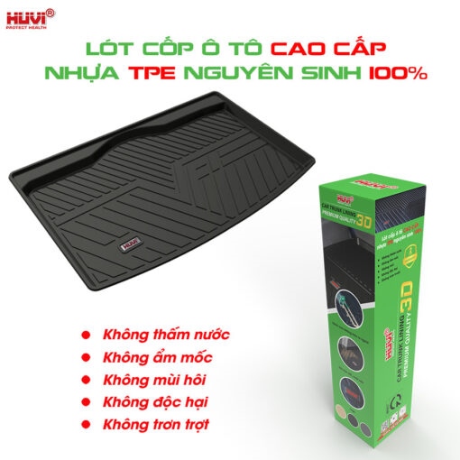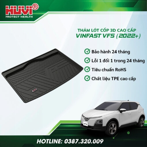 Trước khi tiến hành sản xuất, thảm được quét scan laser theo kích thước sàn xe, sau đó mới làm khuôn nên đảm bảo các yếu tố kỹ thuật phù hợp với từng form xe.Thảm có vách dựng 3D ngăm bụi bẩn, nước, thức ăn rơi bên ngoài sàn xe.Dễ dàng lắp đặt, vệ sinh nhanh chóng.Bề mặt thảm có thiết kế các gờ, rãnh giúp giữ chất bẩn hiệu quả.Chống trơn trượt hàng hóa, hành lý khi di chuyển.Hoàn toàn không mùi hôi, không thấm nước.Chất liệu nhựa TPE cao cấp không độc hại, thân thiện môi trường.Tuổi thọ sản phẩm trên 10 năm.Trọng lượng thảm lót nhẹ so với các dòng sản phẩm trên thị trường như nỉ hay da.Nguồn gốc thảm lót cốp ô tô Vinfast VF5Thảm lót cốp Vinfast VF5 sản xuất tại Việt Nam.Sản phẩm sản xuất 100% tại Việt Nam.Dây chuyền sản xuất công nghệ hút định hình từ Nhật Bản.Vật liệu nhập khẩu từ nước ngoài.Chế độ bảo hành thảm lót cốp ô tô Vinfast VF5Thảm lót cốp ô tô Vinfast VF5 lỗi 1 đổi 1.Bảo hành sản phẩm lên đến 24 tháng.Lỗi 1 đổi 1 trong vòng 24 tháng.Cam kết sản phẩm hoàn toàn chính hãng.Hoàn tiền 100% nếu sản phẩm không đúng mô tả.Freeship toàn quốc.Thảm cốp ô tô Vinfast VF5 đảm bảo khít sàn tuyệt đối, nên bạn yên tâm về chất lượng sản phẩm trong quá trình sử dụng, Huvi hy vọng bạn chọn được thảm lót cốp phù hợp.