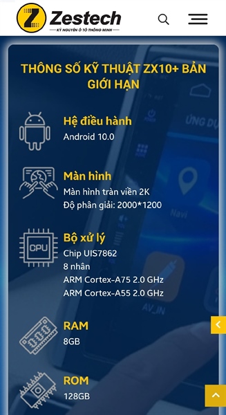 THÔNG SỐ KỸ THUẬT ZX10+ BẢN GIỚI HẠNHệ điều hànhAndroid 10.0Màn hìnhMàn hình tràn viền 2KĐộ phân giải: 2000*1200Bộ xử lýChip UIS78628 nhânARM Cortex-A75 2.0 GHzARM Cortex-A55 2.0 GHzRAM8GBROM128GBCông tyTNHH TM XNK Nội thất ô tô Quang MinhXuất xứMade in ChinaNăm sản xuất2023